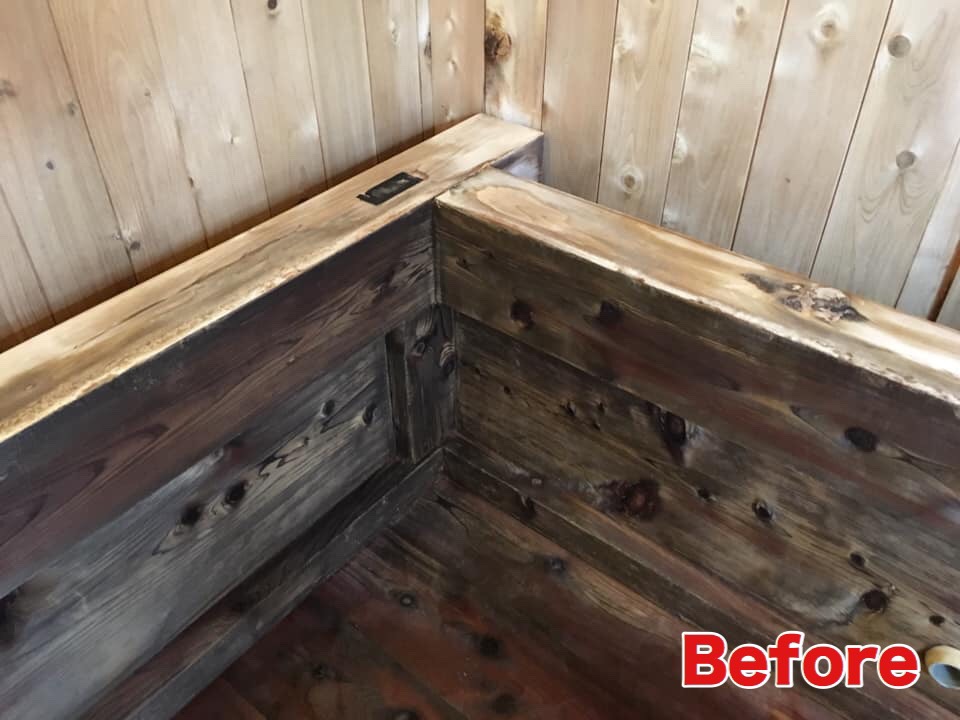 この様に檜深部までカビ特殊技術で落とし更に弊社独自の撥水コーティングを施す事により更なる菌から檜を守り半永久的にカビの繁殖を防ぐ事が可能になりました。(※日常清掃を毎日続けて頂いております。)