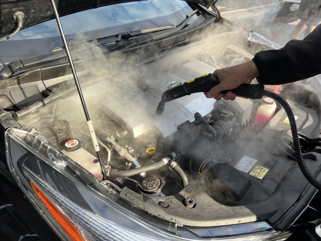 エンジンルームは、スチーマーを使って油汚れなどを落としてクリーニングします。この作業を怠ってしますと、コーティングした際に砂や埃が被った状態で艶が出てしまうのでこちらも手の入りにくいところまで入念に作業します。